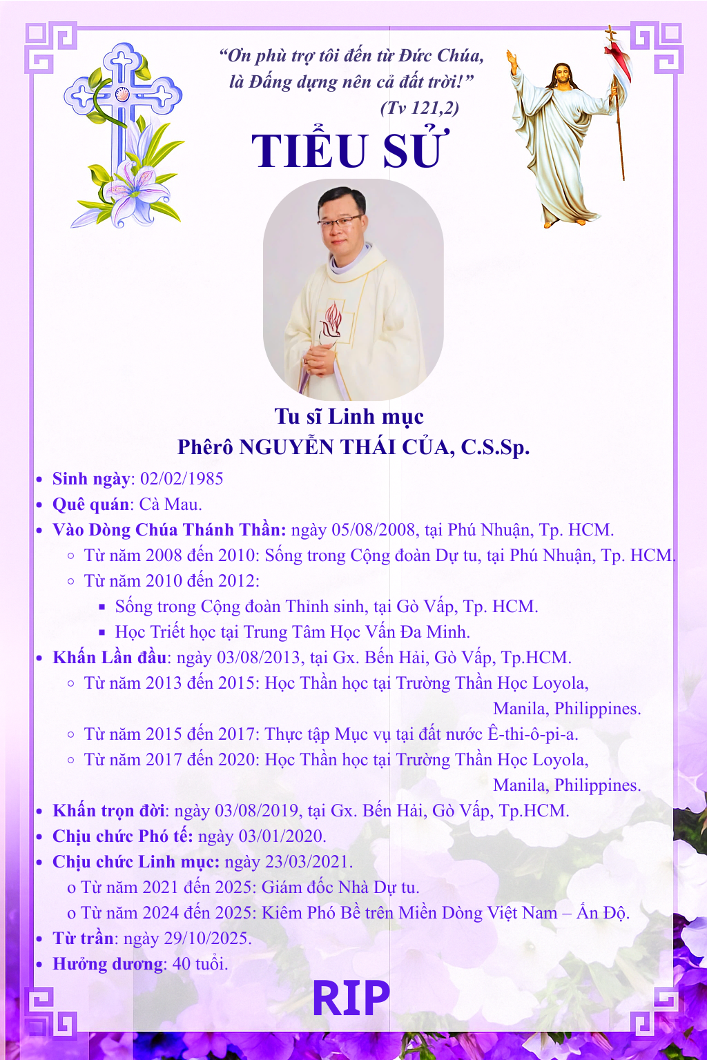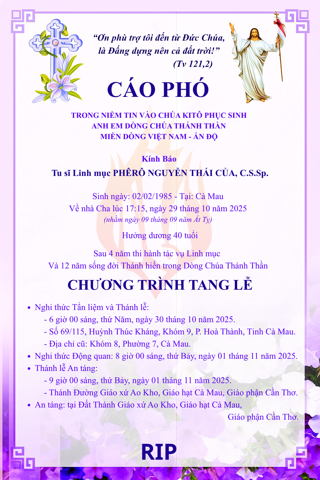 Cáo Phó và Chương Trình Tang Lễ: Tu sĩ Linh mục Phêrô Nguyễn Thái Của, C.S.Sp.