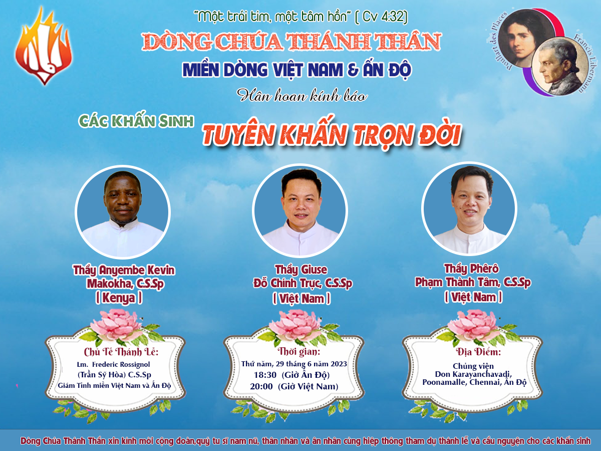Thánh lễ tuyên khấn trọn đời sẽ được cử hành tại Ấn Độ vào ngày 29 tháng 6 năm 2023. Cha giám tỉnh Frederic Trần Sỹ Hoà sẽ chủ tế và nhận lời tuyên khấn của ba khấn sinh. Xin cộng đoàn hiệp ý tham dự thánh lễ và cầu nguyện cho các khấn sinh.